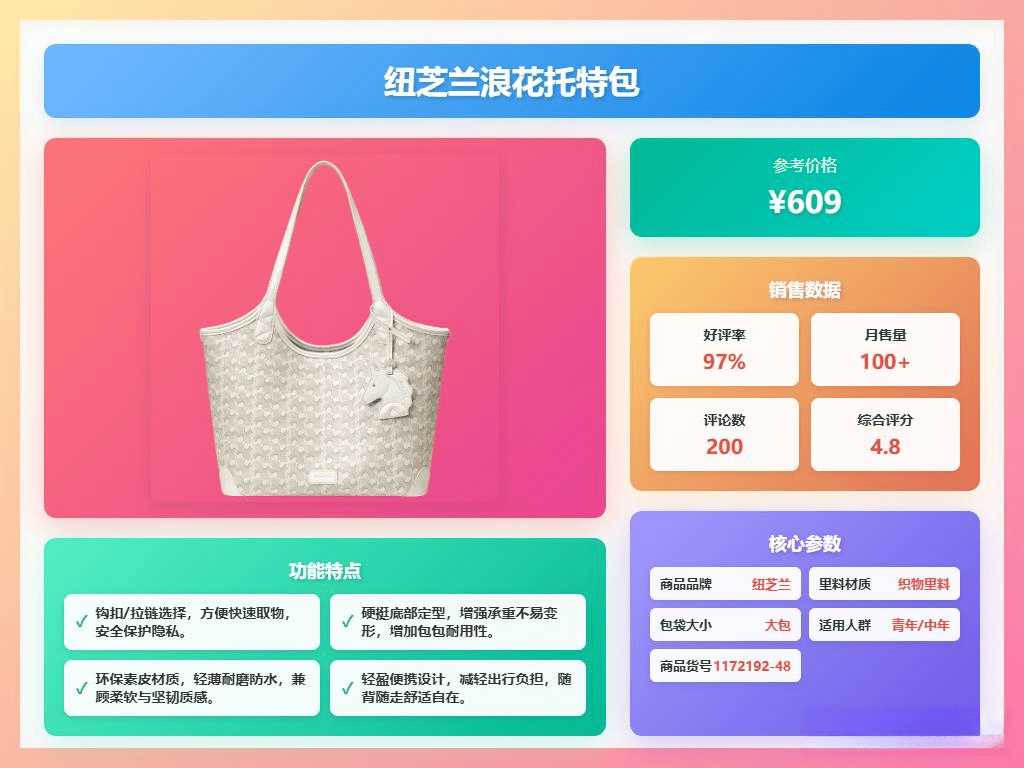 同时,包包在细节设计上也挺有心。采用加固的肩带,提升了耐用性和承重能力,手挽高270mm,手提更舒适。外观上则是经典的老花图案,带点复古韵味,风格偏休闲但又不失职业感。多色可选,加上可拆卸的小挂件,既方便搭配,又增添趣味,整体设计兼具实用性和时尚感。